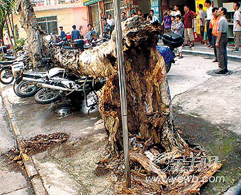 廣州東山區竹絲崗四馬路一棵七層樓高、重千余斤的老樹被一陣大風刮倒,當時正在樹旁邊聊天的六位市民嚇了一跳,快速向兩邊跑散開去?!巴郏『秒U!”目瞪口呆地望著大樹將下邊一排摩托車壓個正著,目擊者陳先生的頭皮一陣發麻。